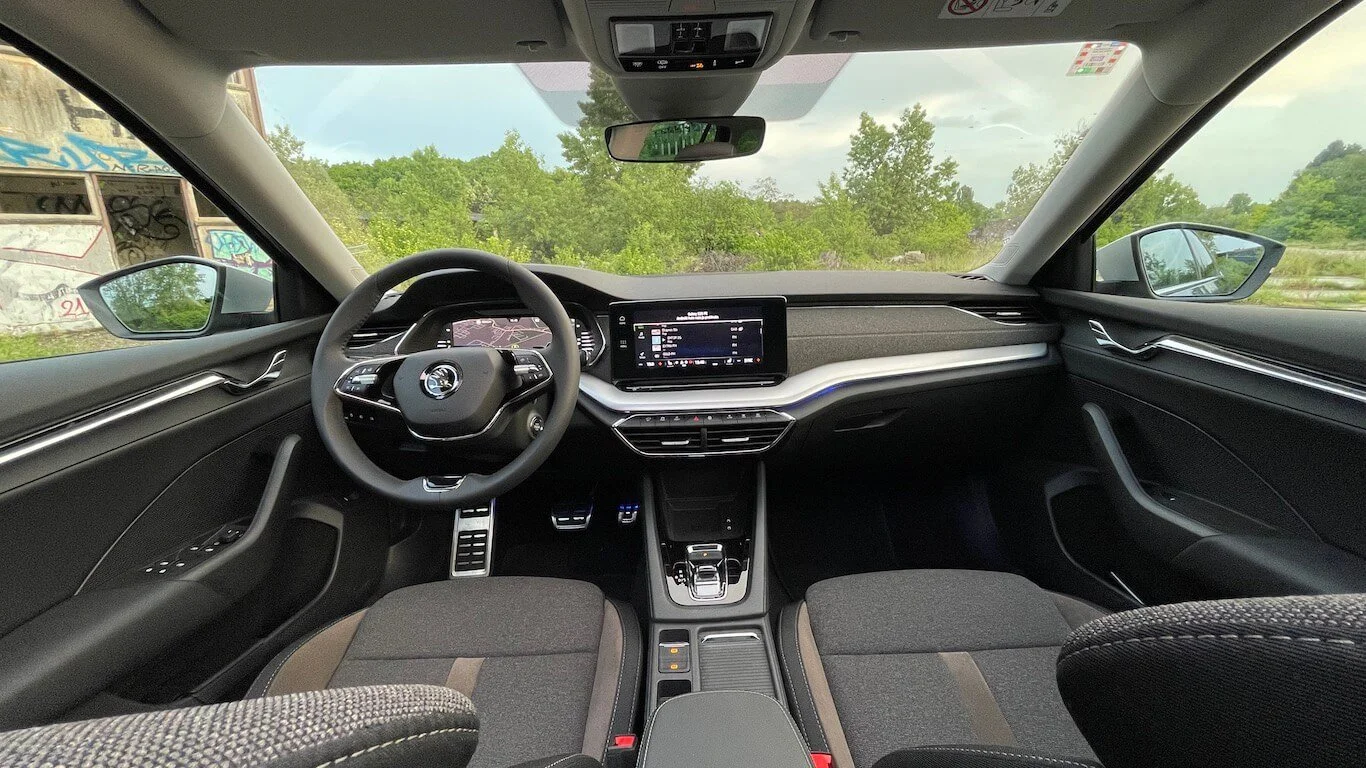 Sjedala su sportska , s dobrom bočnom potporom i vrlo udobna, a Škodin marketinški tim je tu tkaninu odlučio nazvati ThermoFlux. Volan je dvokraki s pokojim kromiranim detaljem i po našem mišljenju izgleda vrlo dobro. Ručice mjenjača zapravo više nema. Umjesto nje je polugica pomoću koje birate brzinu i koja će, kako nam se čini, polako izgurati i zamijeniti sve ručice automatskih mjenjača na tržištu.